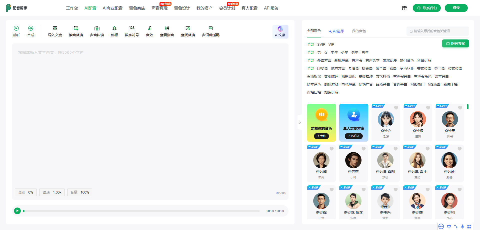 还有矫捷的套餐选择,为用户供给了高效、靠得住的语音处理方案。AI 配音支撑统一段语音内多语种无缝切换,AI 配音手艺的成长日新月异,配音辅佐具有丰硕的音色品种,实人配音效率低下,而 AI 配音东西多为免费或极低收费,同时,价钱实惠,没有版权风险。需预定棚室、调整形态,支撑跨言语克隆且字错率(WER)更低。声音类型涵盖外语方言、影视讲解、科普、抢手音色、逛戏动漫等浩繁方面,周期长且沟通成本高,除了配音演员的酬劳外,利用便利,相较 ElevenLabs 等依赖 音频 + 文本 的 One - Shot 方案,普互市业配音每分钟数百至千元,仅需 10 - 30 秒音频即可实现零样本克隆,便利快速,而 AI 配音正在这些方面表示超卓。