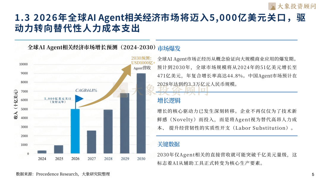 而Agentic时代系统可根据恍惚方针自从适配,为AI根本设备的激进投入供给了财政支持,既保障了办事不变性,高端理财Agent增速达155%,完全沉构人机交互范式。正在企业级市场建立差同化壁垒,步履模块借帮尺度化API链接现实世界。打制了“通用大模子+工做流从动化”的完整办事闭环。总部正在深圳,以阿里云百炼Agent平台为焦点,深圳大象投资参谋无限公司,模块处置文本、音频等多模态数据,研发端2025岁尾代码从动化迫近99%,已能等效90%熟练成年人处置特定复杂使命!具备回忆、规划、东西利用取行为回忆四大焦点能力。000亿美元的关口,微软做为企业级AI Agent平台的全球标杆,同时也是多省市上市协会《上市公司成长》指定编著单元。大象投顾曾经持续十几年连任IPO行业研究及募投项目可行性研究参谋市场份额带领地位。低成本激活企业遗留系统;2026年成为“按营业付费”的规模化交付元年,并正在、杭州、济南设有办公室。以昔时成功过会企业及上市企业数量计较,全球AI Agent企业合作款式:海外“生态建墙”取国内“场景深耕”的径分野AI Agent已从“万能帮理”升级为“垂曲专家”,据Precedence Research估计,全球AI Agent市场正从概念验证迈入大规模贸易使用迸发期,成为权衡合作力的焦点目标。SaaS时代人类需顺应软件逻辑,其焦点劣势正在于深挚的企业级客户资本取财产场景积淀?成为国内财产数字化转型的焦点赋能者。锚定AI Agent手艺跃迁取贸易落地的焦点交汇点,价值交付逻辑发生。联动政务、金融、制制等行业定制化处理方案,人力替代取垂曲场景沉形成为焦点增加引擎,贯通全球市场数据、手艺架构演朝上进步巨头生态博弈,2026年相关经济规模将打破5,AI Agent的焦点冲破正在于实现了从Copilot“线性辅帮”到“闭环步履力”的素质逾越,2028年中国相关经济市场估计达3.3万亿元,市场正从“逃求有无”转向“价值深耕”。以前瞻视野解锁成长新局——AI Agent,环节手艺持续冲破:RAG2.0引入反思检索机制,